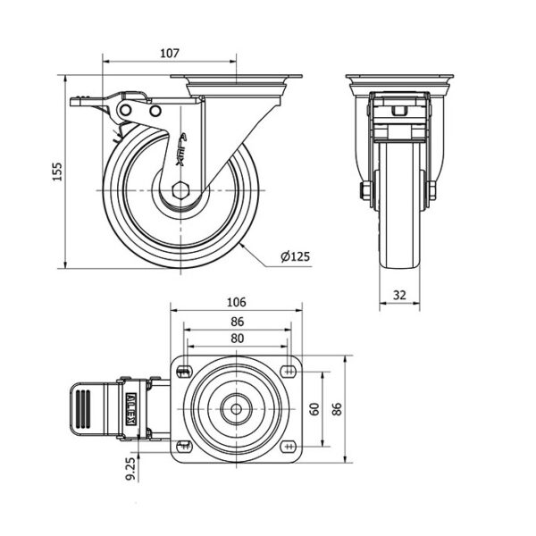 Rueda poliuretano giratoria con freno Alex diametro 125 mm. modelo 2-2937