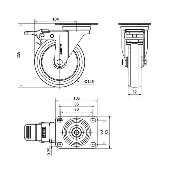 Rueda poliuretano giratoria con freno Alex diametro 125 mm. modelo 2-4885