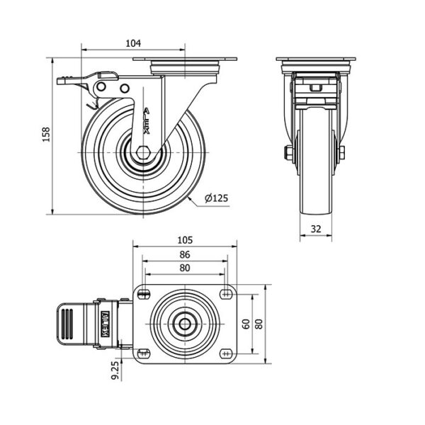 Rueda poliuretano giratoria con freno Alex diametro 125 mm. modelo 2-4895