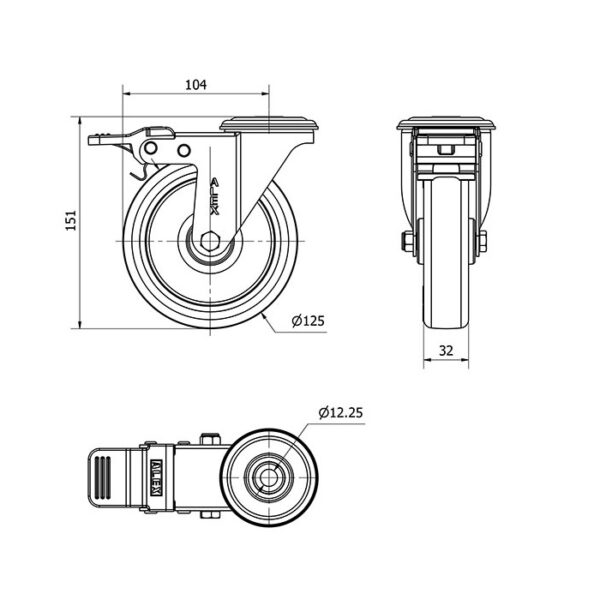 Rueda poliuretano giratoria con freno Alex diametro 125 mm. modelo 2-4907
