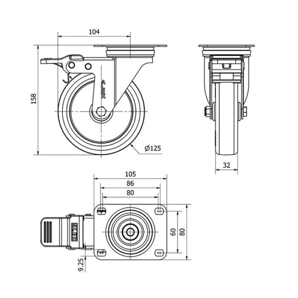 Rueda poliuretano giratoria con freno Alex diametro 125 mm. modelo 2-4955