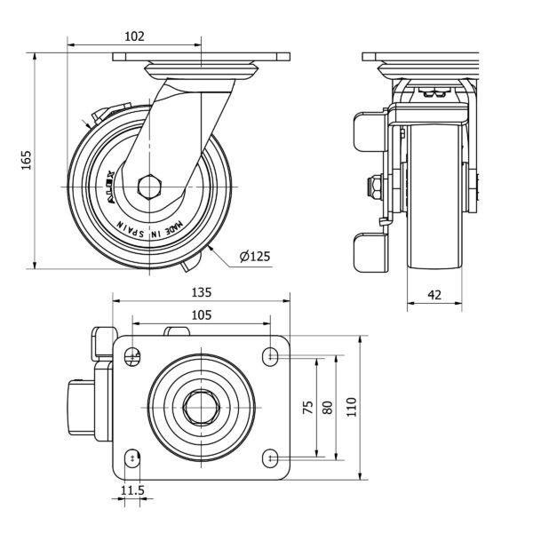 Rueda poliuretano giratoria con freno Alex diametro 125 mm. modelo 4-1210 EAN 8422202412108