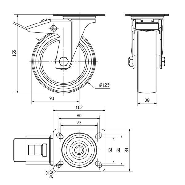 Rueda poliuretano giratoria con freno Alex diametro 125 mm. modelo TW0219 EAN 8422202002194