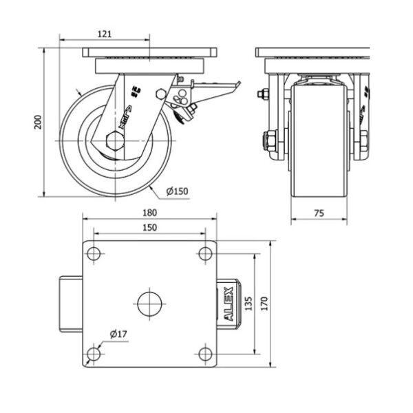 Rueda poliuretano giratoria con freno Alex diametro 150 mm. 2-0075