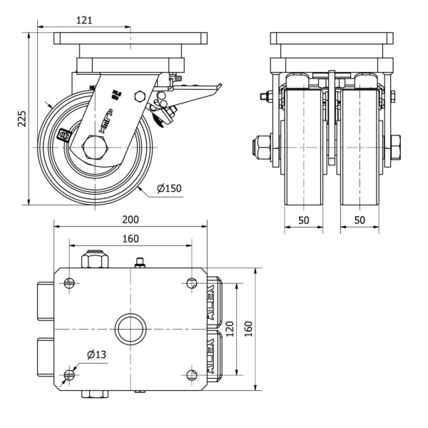 Rueda poliuretano giratoria con freno Alex diametro 150 mm. modelo 2-3810