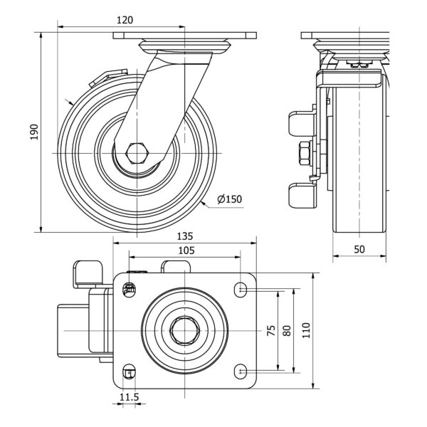Rueda poliuretano giratoria con freno Alex diametro 150 mm. modelo 4-1617