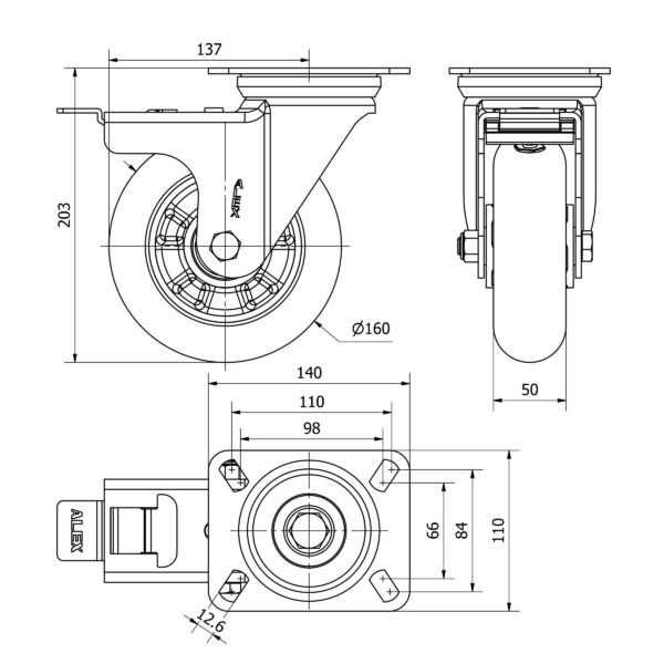 Rueda poliuretano giratoria con freno Alex diametro 160 mm. modelo 2-3968