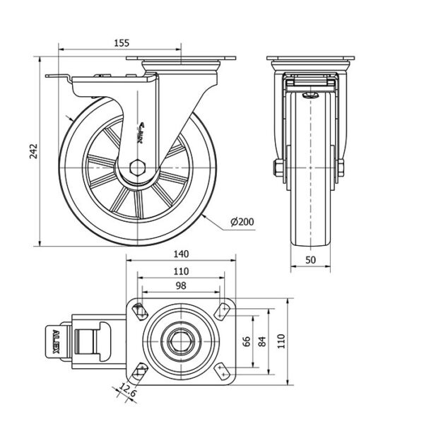 Rueda poliuretano giratoria con freno Alex diametro 200 mm. 2-3694