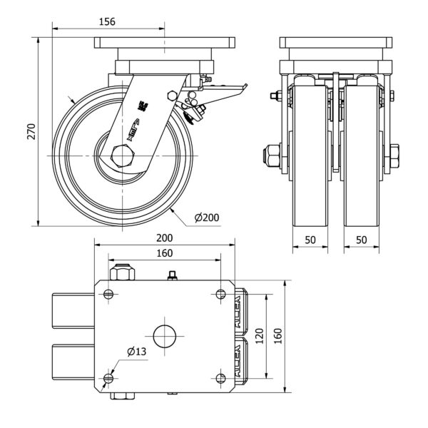 Rueda poliuretano giratoria con freno Alex diametro 200 mm. 2-3811