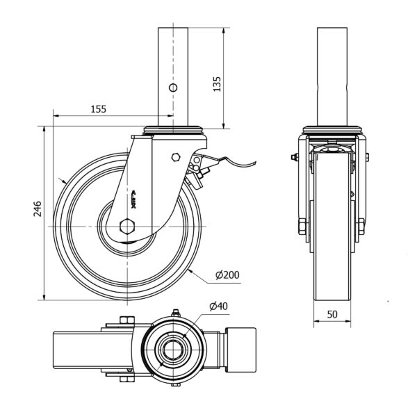 Rueda poliuretano giratoria con freno Alex diametro 200 mm. modelo 2-2496