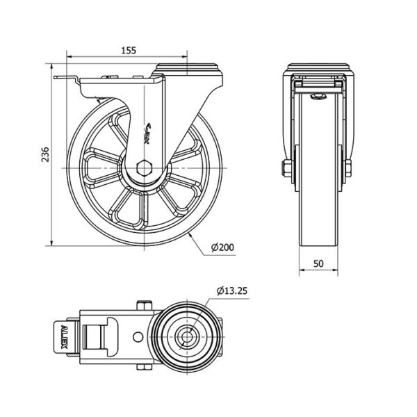 Rueda poliuretano giratoria con freno Alex diametro 200 mm. modelo 2-2545