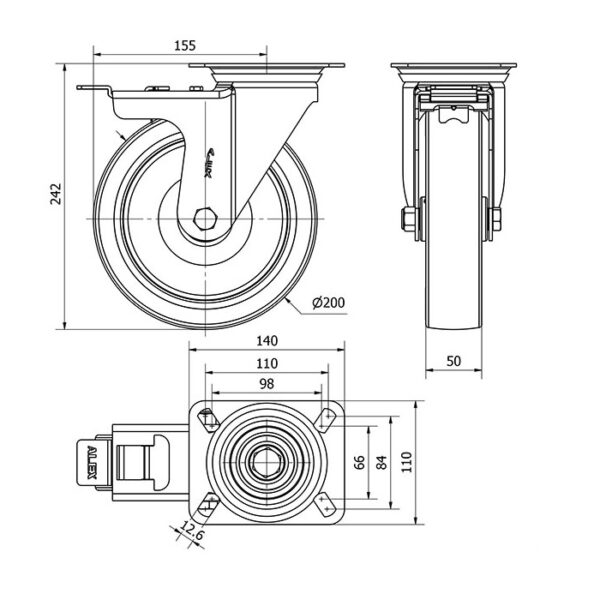 Rueda poliuretano giratoria con freno Alex diametro 200 mm. modelo 2-2881