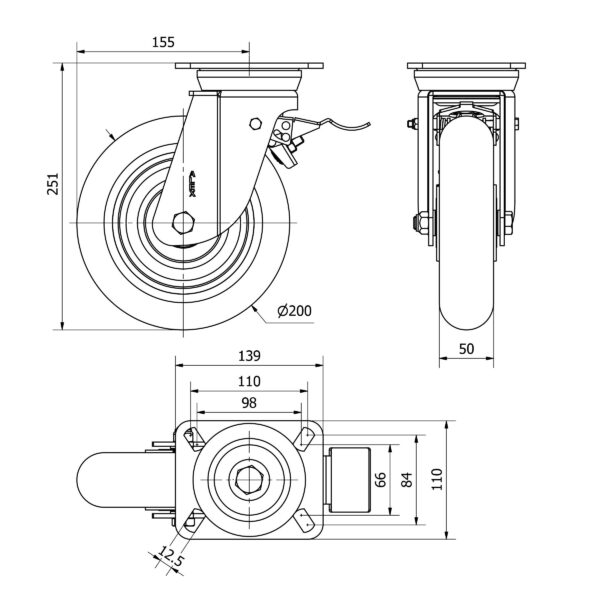 Rueda poliuretano giratoria con freno Alex diametro 200 mm. modelo 2-3533