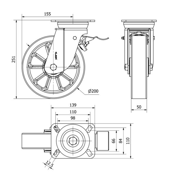 Rueda poliuretano giratoria con freno Alex diametro 200 mm. modelo 2-3612