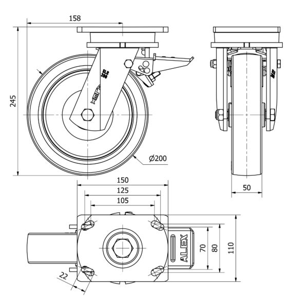 Rueda poliuretano giratoria con freno Alex diametro 200 mm. modelo 2-3661