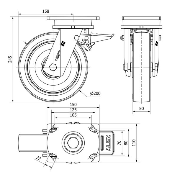 Rueda poliuretano giratoria con freno Alex diametro 200 mm. modelo 2-3662