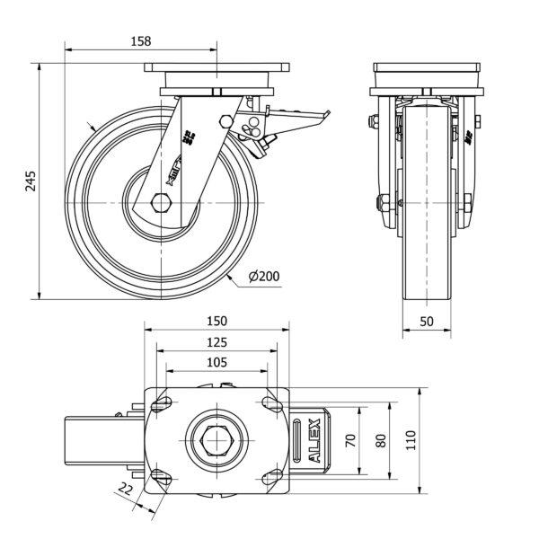 Rueda poliuretano giratoria con freno Alex diametro 200 mm. modelo 2-3668