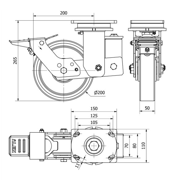 Rueda poliuretano giratoria con freno Alex diametro 200 mm. modelo 2-3944