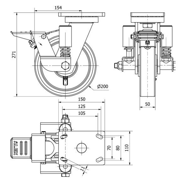 Rueda poliuretano giratoria con freno Alex diametro 200 mm. modelo 2-4040