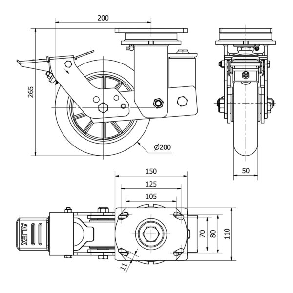 Rueda poliuretano giratoria con freno Alex diametro 200 mm. modelo 2-4058