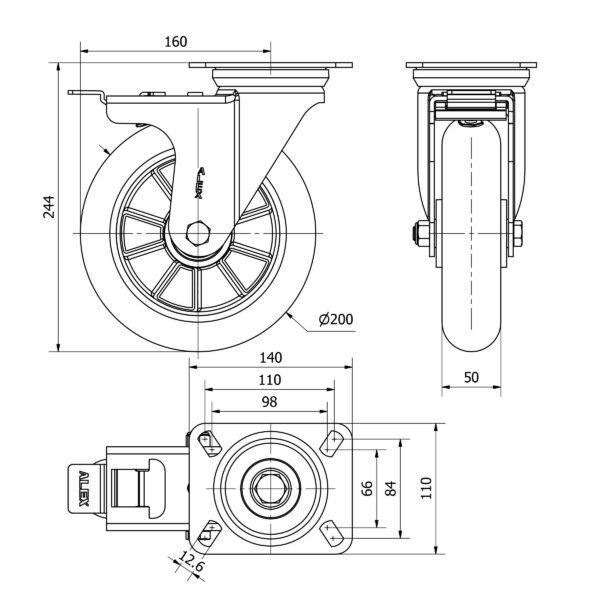 Rueda poliuretano giratoria con freno Alex diametro 200 mm. modelo 2-4386