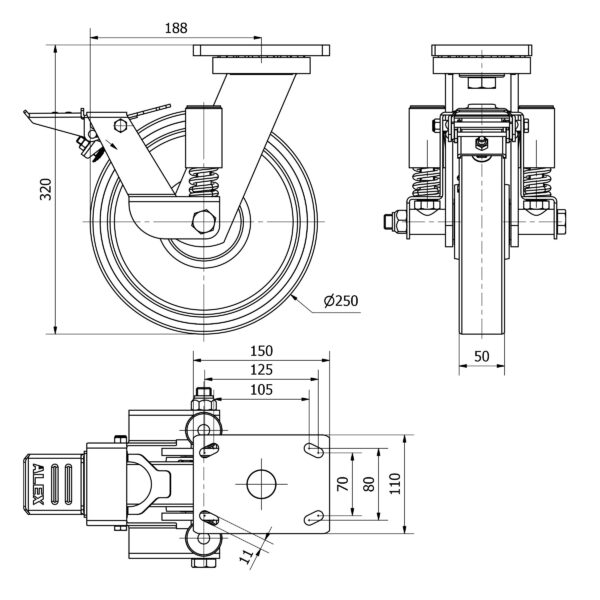 Las ruedas Alex serie HLS-HU son ruedas con el núcleo de acero y con la banda de gpoliuretano fundido con dureza de 95? shore A, indicadas para soportar altas cargas hasta 1.250 Kg. Con soporte de suspensión elástica, mediante incorporación de muelle muy resistente, ideal para suelos irregulares donde su amortiguación actúa. Se utilizan en útiles de transporte logístico, aéreas de exteriores, gradas móviles, plataformas elevadoras, carros de transporte, maquinaria pesada del sector de la construcción y grúas móviles. HU: alta absorción de golpes. Condiciones de pavimento desfavorables. Superficies rugosas, quebradas, con virutas metálicas, manchas de aceite, cristales, grasas y grava.