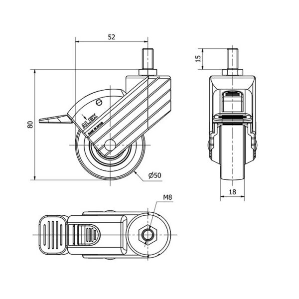 Rueda poliuretano giratoria con freno Alex diametro 50 mm. modelo 1-0771