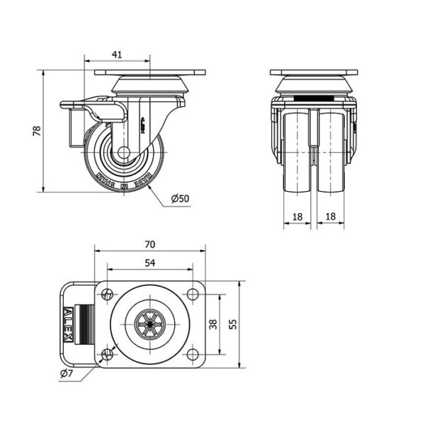 Rueda poliuretano giratoria con freno Alex diametro 50 mm. modelo 1-0791