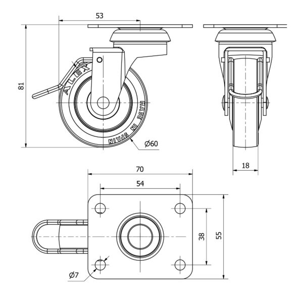Rueda poliuretano giratoria con freno Alex diametro 60 mm. modelo 2-2569