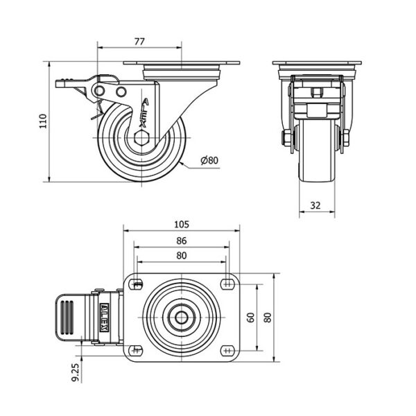 Rueda poliuretano giratoria con freno Alex diametro 80 mm. modelo 2-2366