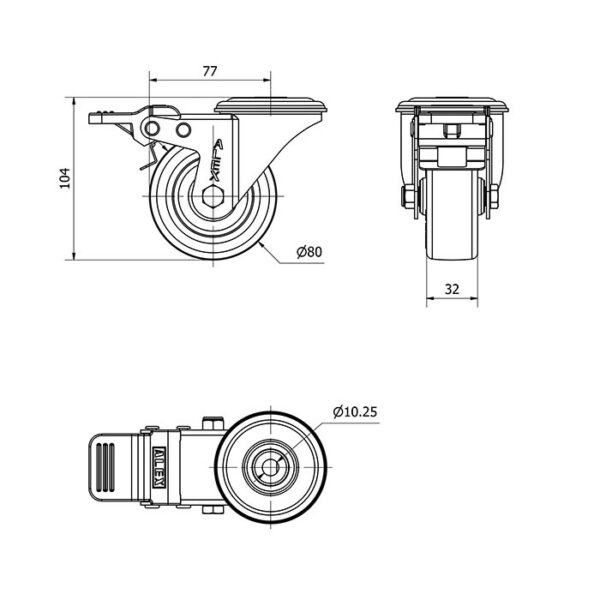 Rueda poliuretano giratoria con freno Alex diametro 80 mm. modelo 2-2378