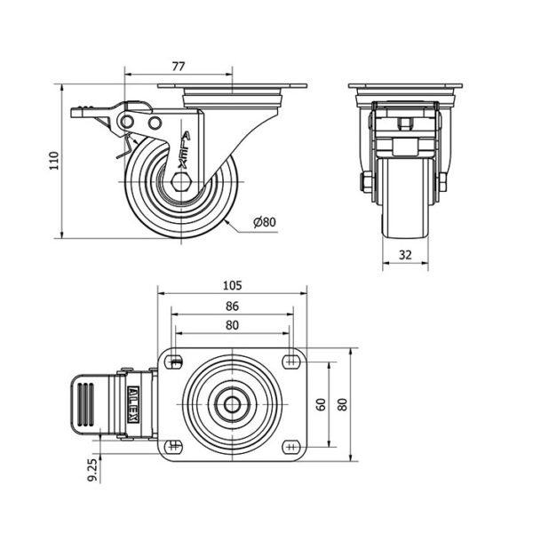Rueda poliuretano giratoria con freno Alex diametro 80 mm. modelo 2-2920