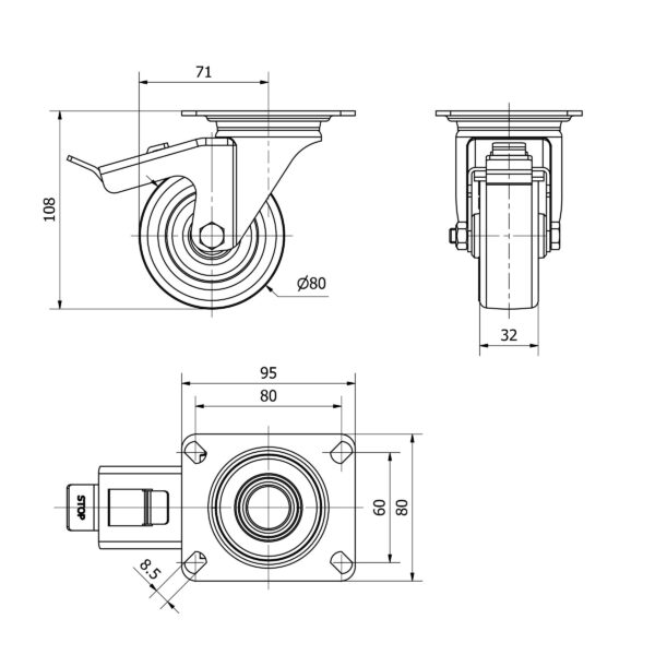 Rueda poliuretano giratoria con freno Alex diametro 80 mm. modelo 2-3098 EAN 8422202230986