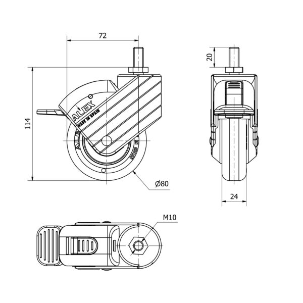 Rueda poliuretano giratoria con freno Alex diametro 80 mm. modelo 2-3572