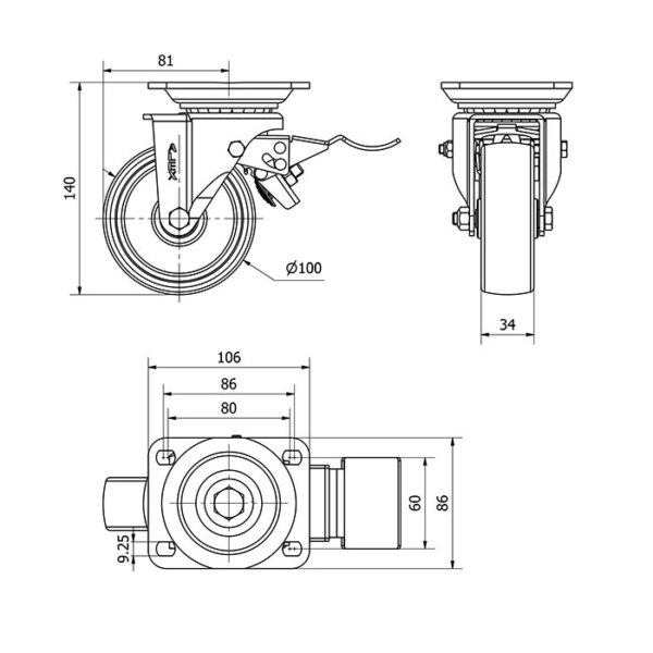 Rueda resina fenolica giratoria con freno Alex diametro 100 mm. modelo 2-1626