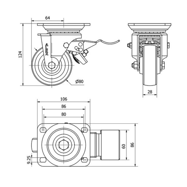 Rueda resina fenolica giratoria con freno Alex diametro 80 mm. modelo 2-1622