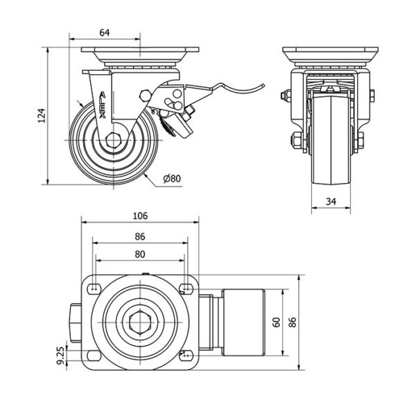 Rueda resina fenolica giratoria con freno Alex diametro 80 mm. modelo 2-1625