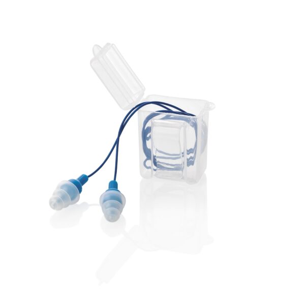 Tapón auditivo reutilizable de silicona hipoalergénica de atenuación alta (33 dB). Tapones lavables, suaves y de gran comodidad. Cordón de seguridad para evitar pérdidas y facilitar su uso. Con un elemento metálico en su interior, ayudan a su fácil localización en caso de pérdida. Su estructura permite no tener contacto directo con los tapones (mayor higiene). Tapón y cordón de color azul para mayor visualización en la industria relacionada con el procesado de alimentos. Dispensador de 100 pares en cajita almacenamiento individual, transparente para mayor higiene, con clip de sujeción. Para su empleo en actividades con nivel de ruido alto o muy alto en la industria de alimentación (procesado de alimentos, cadenas de alimentación, de fruta, mataderos, avicultura, mantenimiento en alimentaria, etc.).