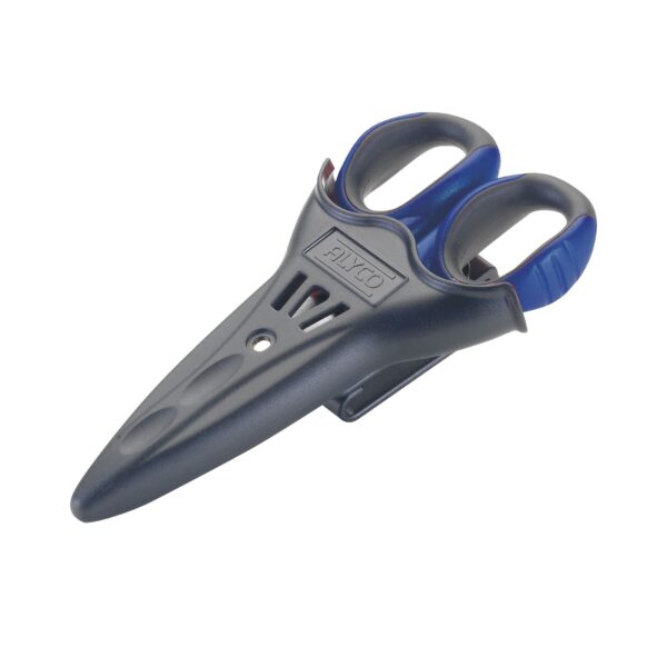 Tijera electricista con funda 145 mm. Alyco codigo 108215 EAN 8421504082156 n nEstuche de plástico que asegura la tijera evitando su salida, y evitando cortes accidentales a la hora de guardar el bolsillo o en otros lugares.nTijera de filos de Acero Inoxidable, perfectamente alineados y con un remache especial reforzado. El corte es fácil, cómodo y limpio.nLos filos de corte son dentados y perfectamente acabados, dando mas precisión y limpieza de corte, y evitando el deslizamiento de la pieza a cortar. La muesca para pelar cables es un complemento ideal para el electricista. El remache ajustable mantiene la alineación de los filos para un perfecto corte.nLos mangos están fabricados en Nylon de gran resistencia y elastómero blando, para mas comodidad y mejor transmisión de fuerza. Esto hace que la tijera sea muy ergonómica, evitando la fatiga incluso en usos repetitivos.