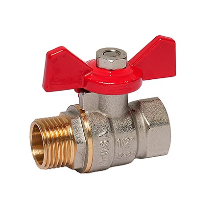 Válvula de esfera de latón niquelado según EN 12165 PN-25, con maneta de mariposa de aluminio roja o azul. Conexiones Rosca Gas ISO 228/1. Temperatura máxima 120ºC. Prensa estopa con guarnición de PTFE.