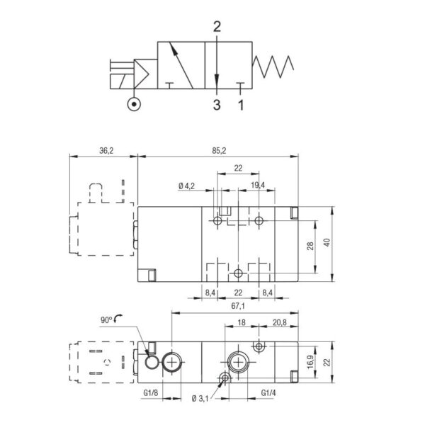 Valvula neumatica Aignep 3/2 N.C. 1/4″ monoestable retorno muelle 01VA03NC03