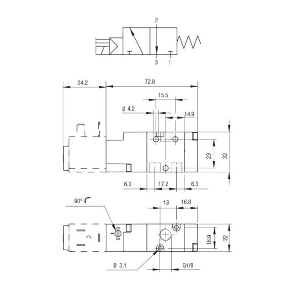 Valvula neumatica Aignep 3/2 N.C. 1/8″ monoestable retorno muelle 01VS03NC02