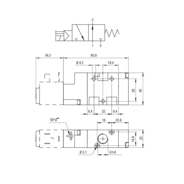 Valvula neumatica Aignep 3/2 N.O. 1/4″ monoestable retorno muelle 01VS03NO03