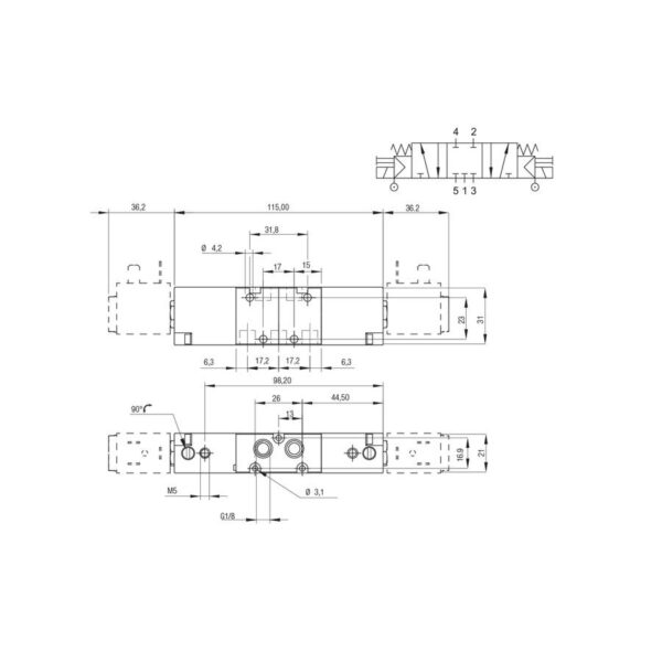 Valvula neumatica Aignep 5/3 C.C. 1/8″ monoestable retorno muelle 01VA07CC02