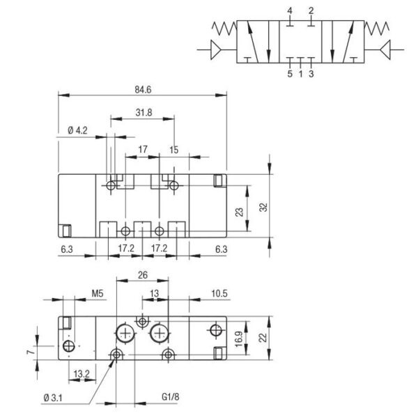 Valvula neumatica Aignep 5/3 C.C. 1/8″ monoestable retorno muelle 01VP07CC02