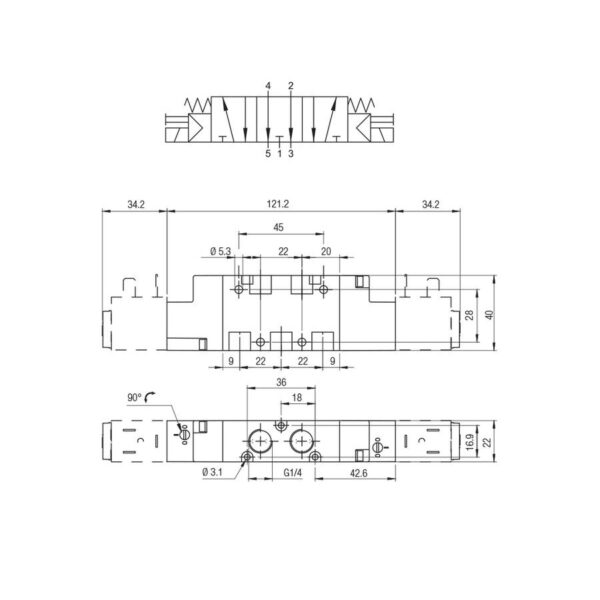 Valvula neumatica Aignep 5/3 O.C. 1/4″ monoestable retorno muelle 01VS07OC03