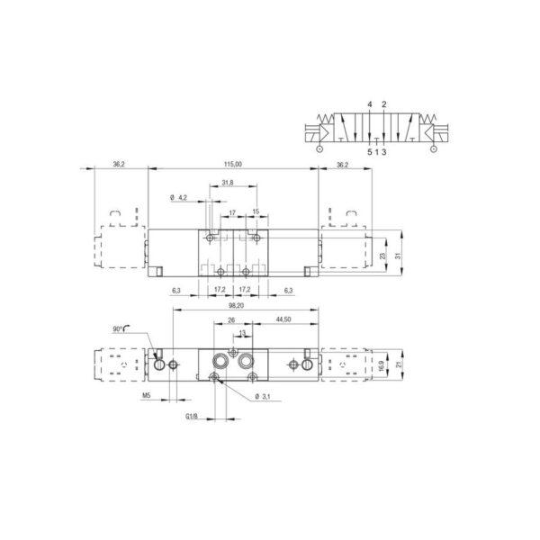Valvula neumatica Aignep 5/3 O.C. 1/8″ monoestable retorno muelle 01VA07OC02