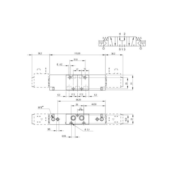 Valvula neumatica Aignep 5/3 P.C. 1/8″ monoestable retorno muelle 01VA07PC02
