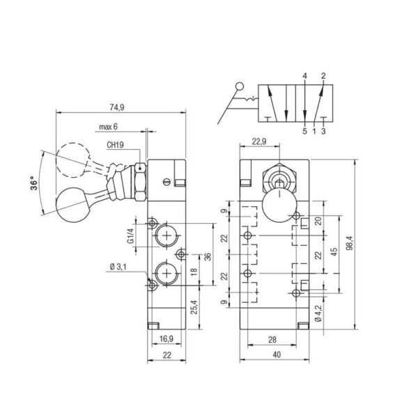 Valvula palanca Aignep 5/2 N.C. 1/4″ monoestable retorno muelle 01VL050003