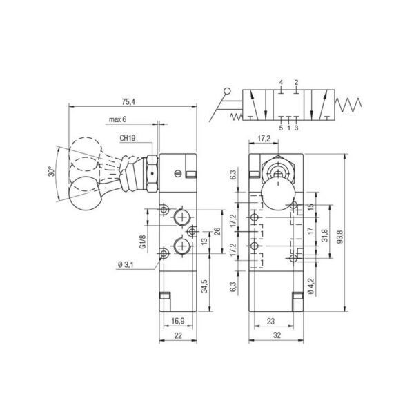 Valvula palanca Aignep 5/3 C.C. 1/8″ monoestable retorno muelle 01VL07CC02
